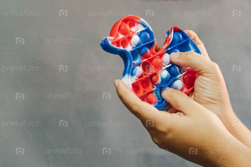 Детская антистрессовая игрушка простая ямочка в виде уточки в женских руках. Серый фон. Крупный план поп-игрушки