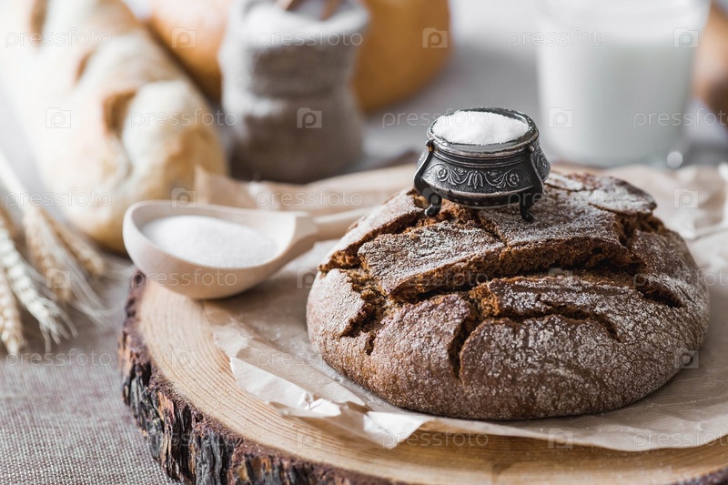 Свежий вкусный хлеб крупным планом и соль. Свежеиспеченный хлеб на закваске с золотой корочкой на деревянной доске. Контекст пекарни с вкусным хлебом. Кондитерские изделия