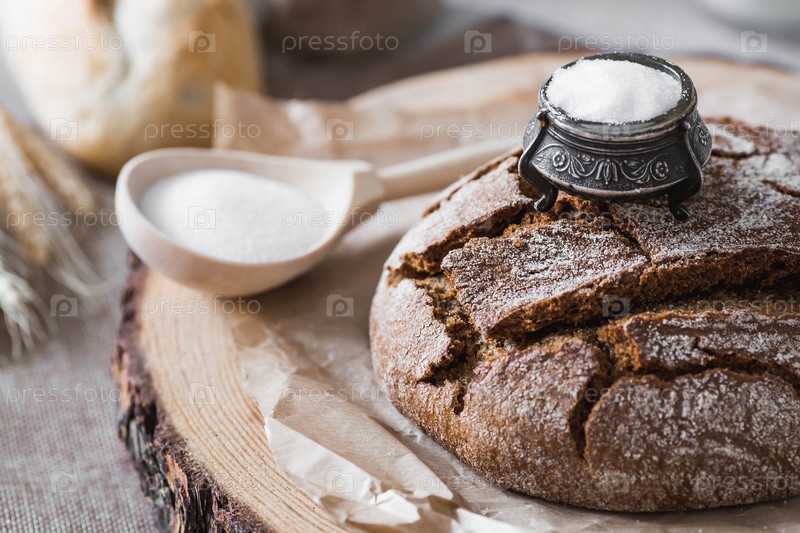 Свежий вкусный хлеб крупным планом и соль. Свежеиспеченный хлеб на закваске с золотой корочкой на деревянной доске. Контекст пекарни с вкусным хлебом. Кондитерские изделия
