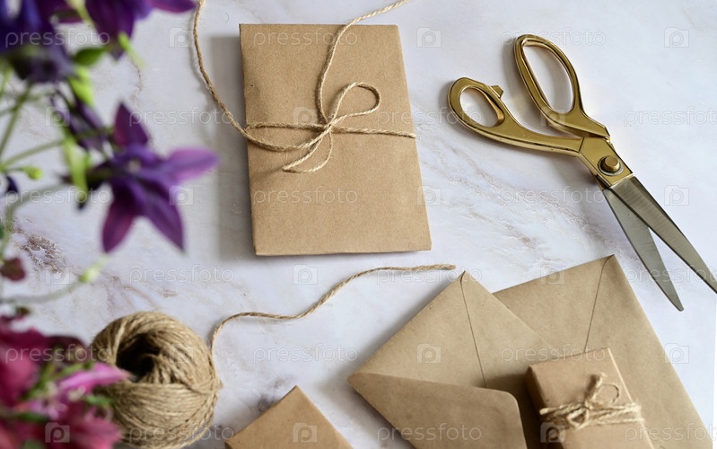 Розовые и голубые цветы, открытка, крафт, шпагат. Макет женского дня или Дня матери, Дня святого Валентина, плоский, вид сверху