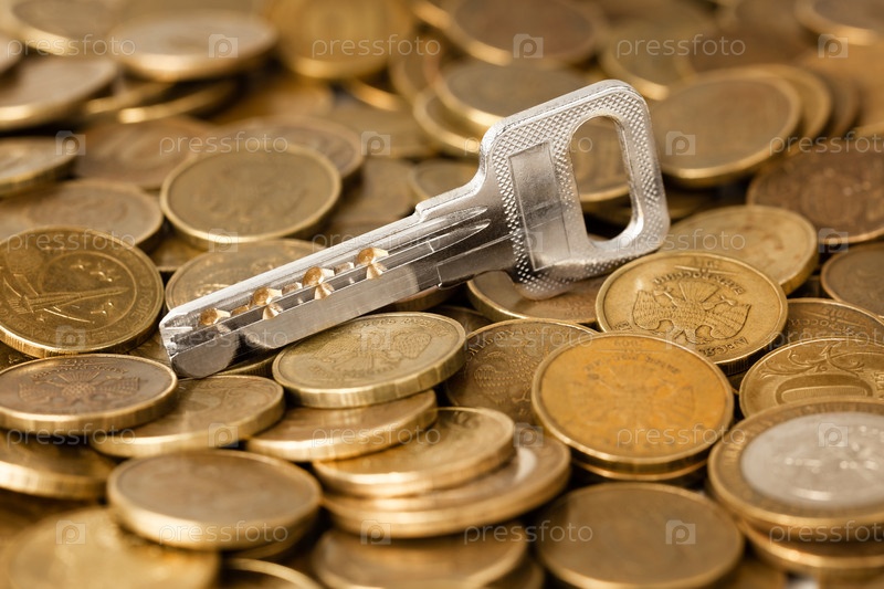 Плоский ключ на куче желтых монет крупным планом