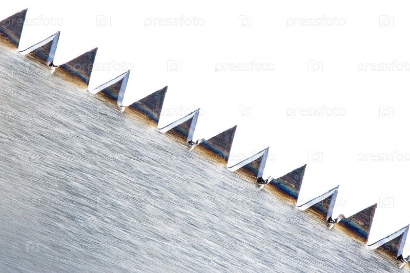 Острые зубы ручной пилы по дереву на белом фоне, макрос
