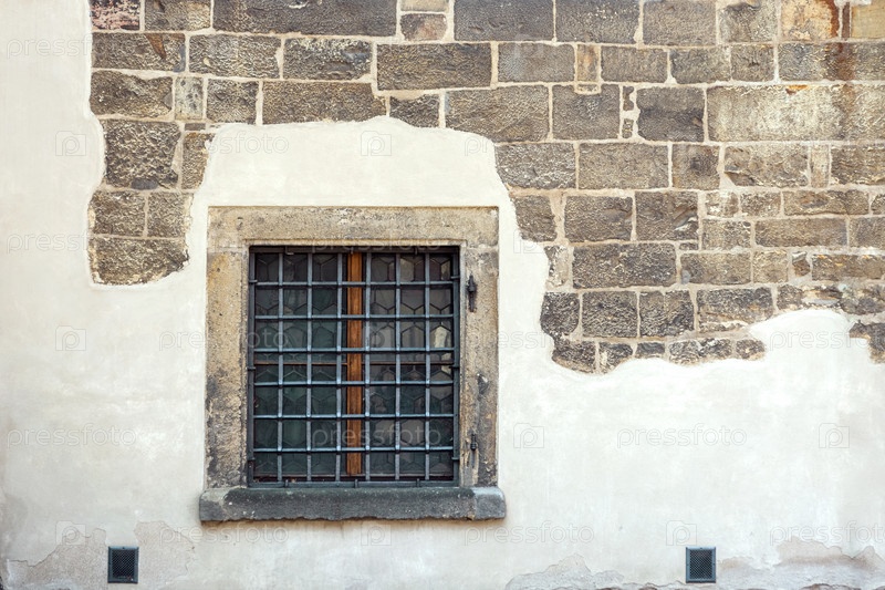 Квадратное окно с металлической решеткой на фоне частично оштукатуренной стены из каменных блоков. Из серии "Окно в мир"