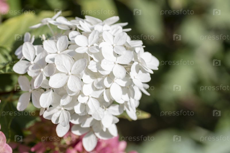 Соцветие гортензии, красивые белые цветы крупным планом с копьем