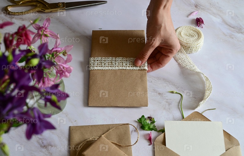 Розовые и голубые цветы, открытка, крафт, шпагат. Макет женского дня или Дня матери, Дня святого Валентина, плоский, вид сверху