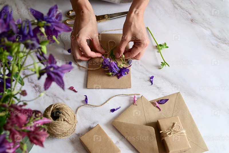 Розовые и голубые цветы, открытка, крафт, шпагат. Макет женского дня или Дня матери, Дня святого Валентина, плоский, вид сверху