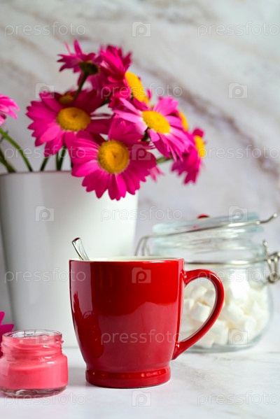 Красная кружка с чаем на фоне букета красных цветов
