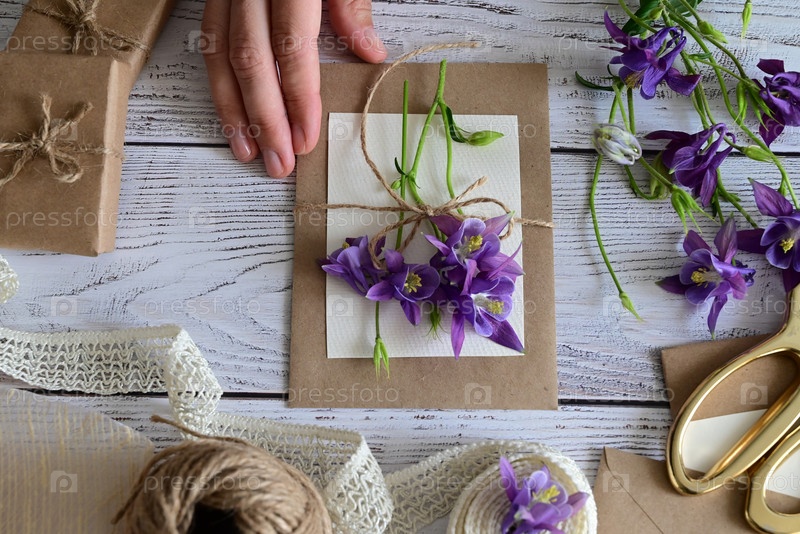 Розовые и голубые цветы, открытка, крафт, шпагат. Макет женского дня или Дня матери, Дня святого Валентина, плоский, вид сверху