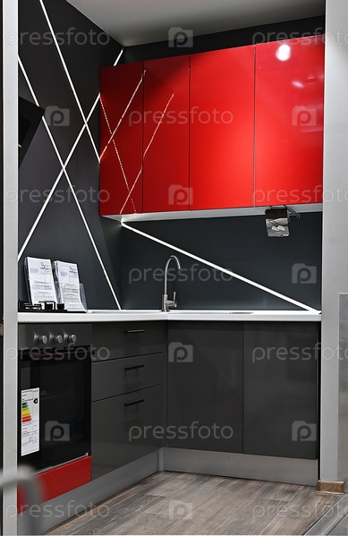 Внутренняя кухня черного цвета с красными штрихами, готовая к выпуску, с выходом на террасу магазина с бытовой техникой и деревянным полом из керамогранита