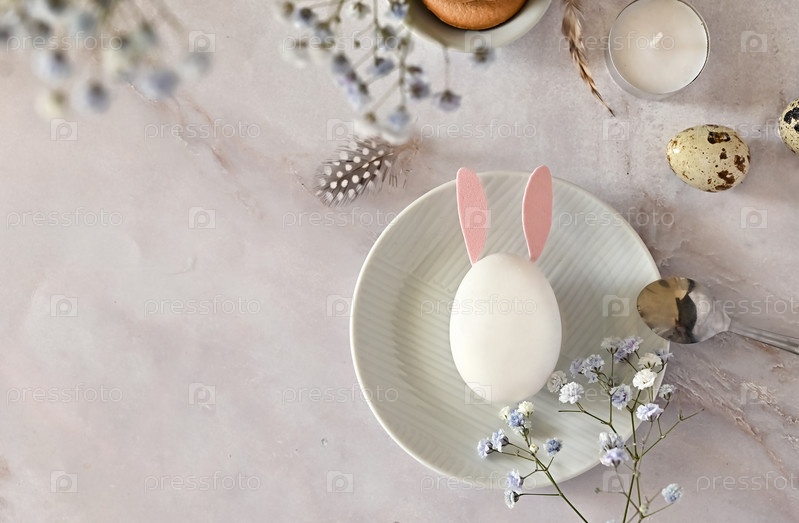 Пасхальная композиция из яиц и цветов на светлом фоне. Пасхальный заяц. Нежная поздравительная открытка к празднику Пасхи. Вид сверху, копия, плоская планировка