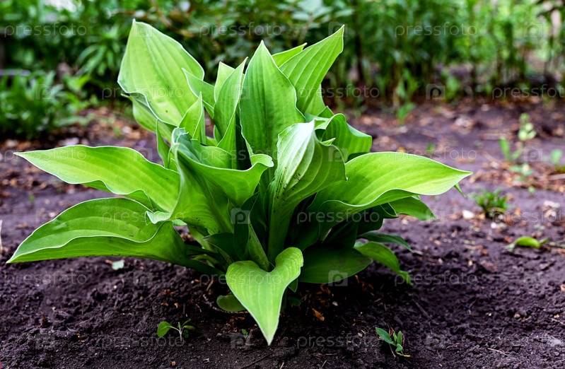 Молодые листья хосты растут в саду
