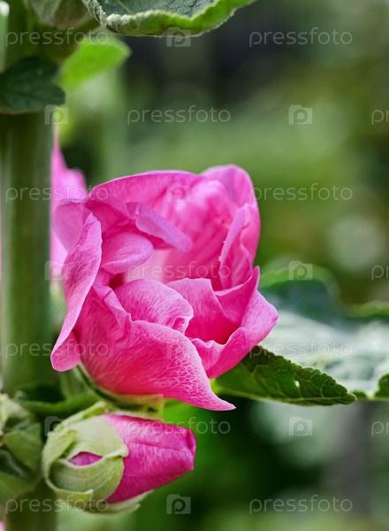 Мягкий фокус. Крупный план красивых цветов и бутонов лаватера триместриса. Однолетняя мальва. Цветок лаватера триместрис в саду. Крупный план розовой мальвы. Мальва триместрис. Цветы в цвету. Лето