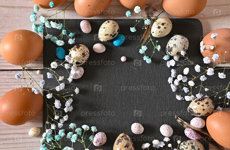 Создайте пасхальную композицию из пасхальных перепелиных яиц и цветов на белом деревянном фоне. Поздравительная открытка на праздник Пасхи. Вид сверху, копия, плоская планировка