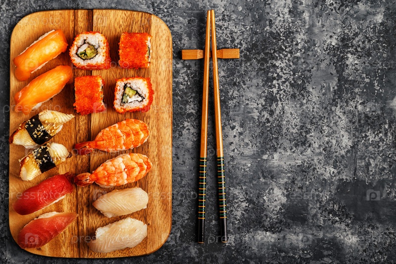 Суши-сет: суши и суши-роллы на деревянной тарелке