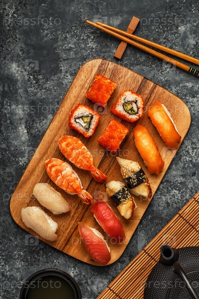 Суши-сет: суши и суши-роллы на деревянной тарелке