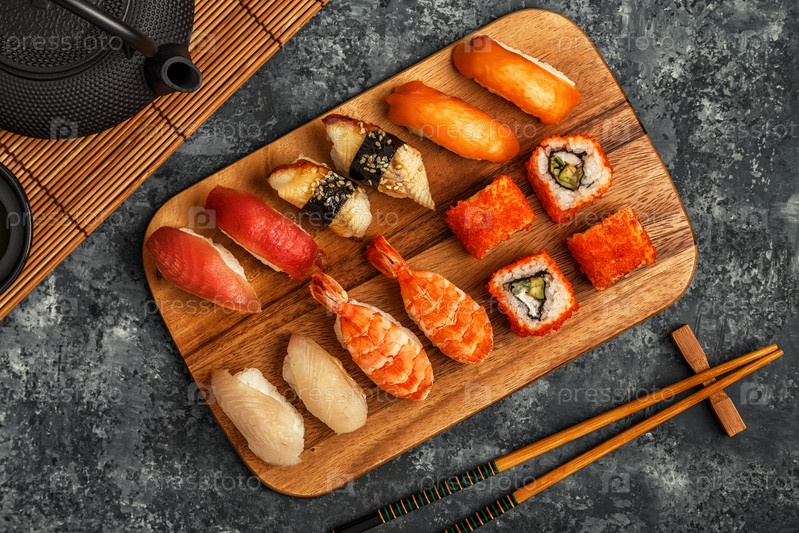 Суши-сет: суши и суши-роллы на деревянной тарелке