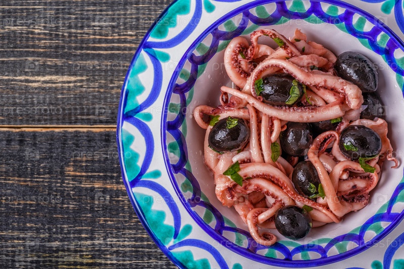 Жареные кальмары со щупальцами, украшенные петрушкой и оливками