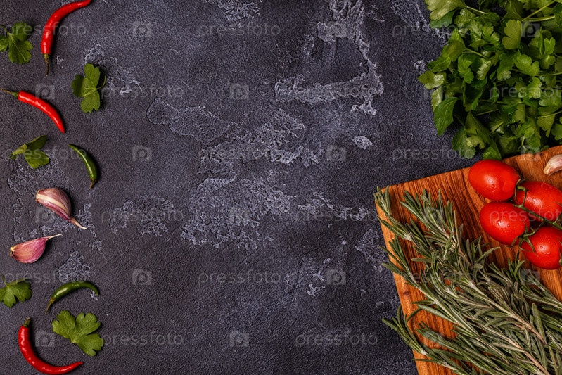 Овощи, специи, травы для приготовления пищи - петрушка, розмарин, помидоры, чеснок, перец чили