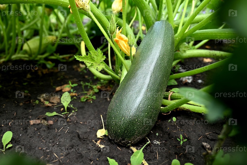 Зеленые молодые цуккини с желтым цветком на летней кровати. Зеленая тыква в овощном поле. Садовый фон с кабачками в открытом грунте, крупным планом