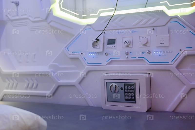 Сочи, Россия - 31 августа 2022 г.: Интерьер футуристического капсульного гостиничного номера в аэропорту