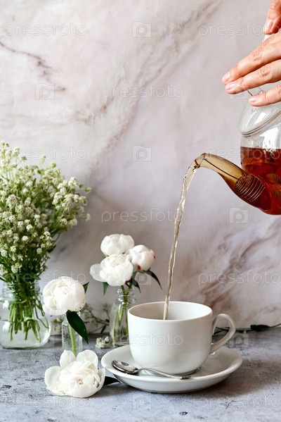 Свежая белая гипсофила, пионы на белом фоне. Дата свадьбы. Приглашение на праздник. Поздравление. Пустое место для текста. Вид сверху
