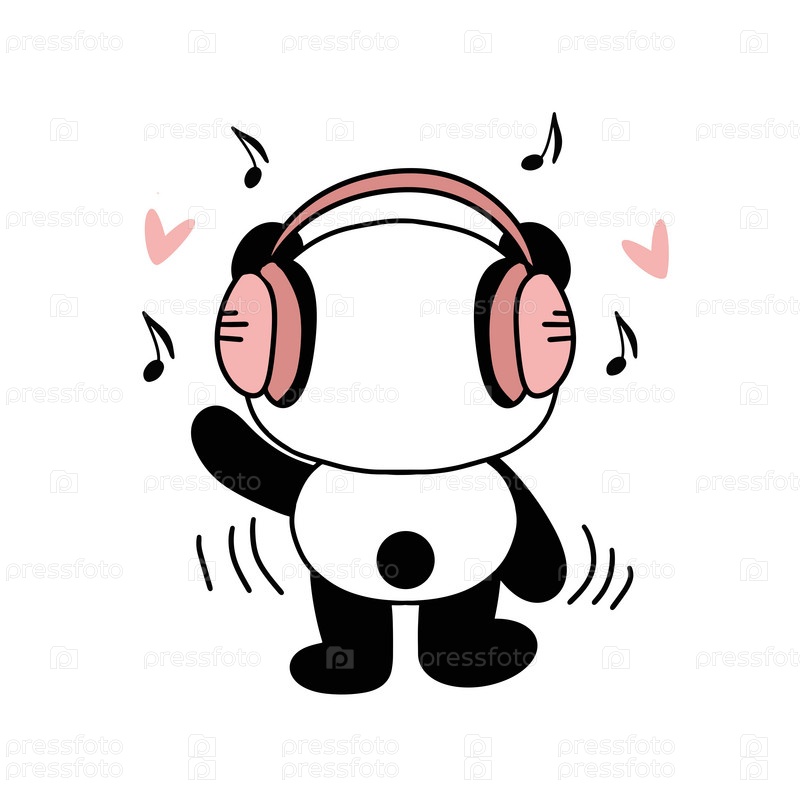 Милая панда любит слушать музыку в наушниках. Иллюстрация в современном стиле для одежды, печати, этикеток, наклеек, дизайна поверхности. белый фон