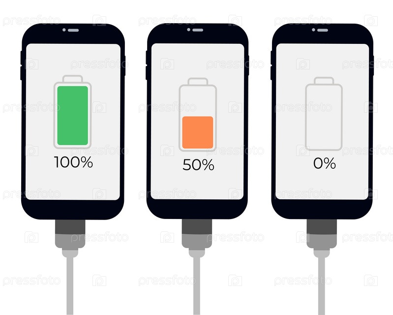 Набор смартфонов с индикатором уровня зарядки батареи и подключением USB.Векторная инфографика