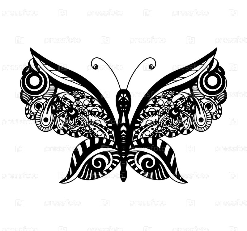 Декоративный элемент в виде бабочки в стиле зентангл. Шаблон для оформления открыток, футболок, постеров, татуировок, рисунков хной. Книжка-раскраска для детей и взрослых