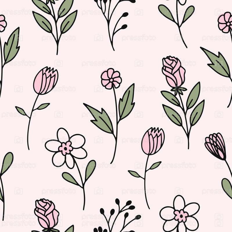 Бесшовный узор с изображением весенних цветов, выделенных на розовом фоне. Векторная иллюстрация