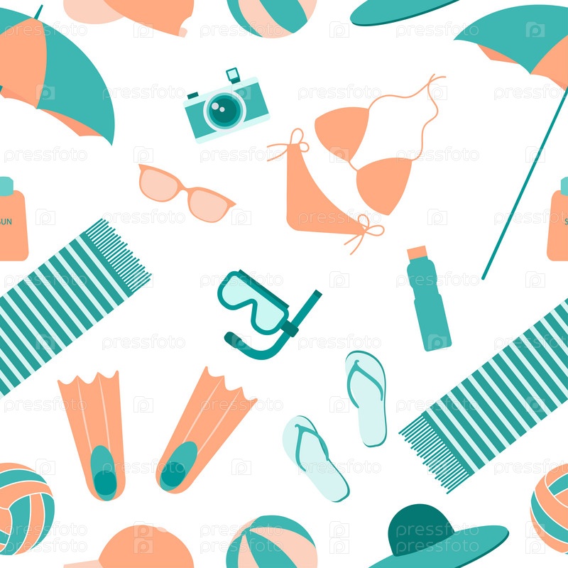 Летний бесшовный узор. Аксессуары для отдыха на море. Подходит для печати, текстиля, фона, обоев, оберточной бумаги, упаковки. Белый фон