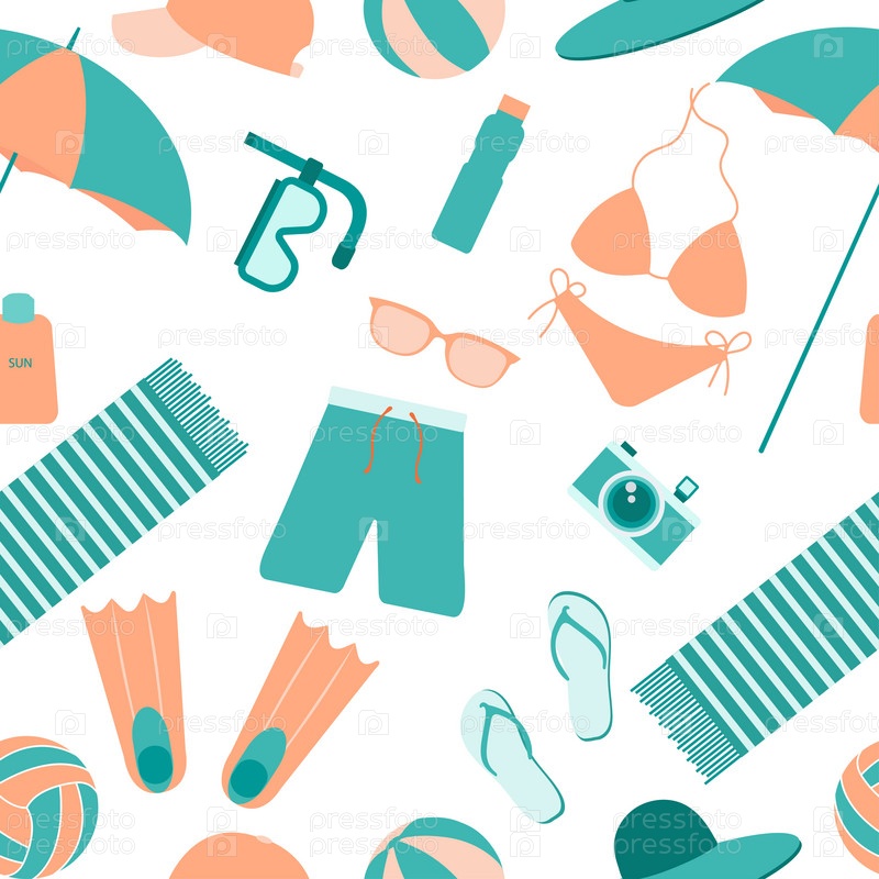 Летний бесшовный узор. Аксессуары для отдыха на море. Подходит для печати, текстиля, фона, обоев, оберточной бумаги, упаковки. белый фон