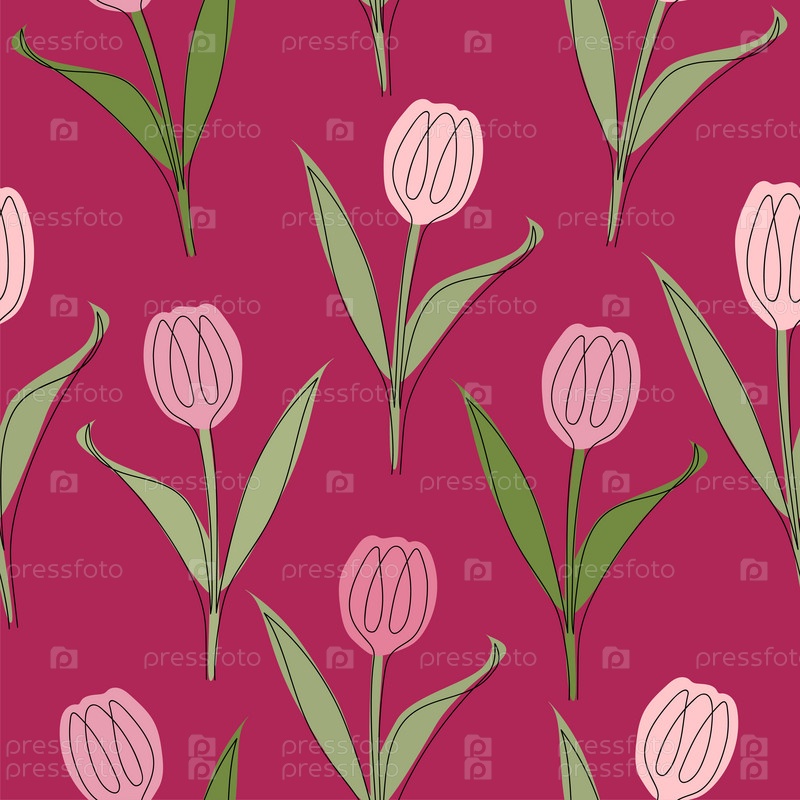 Бесшовный узор из тюльпанов, нарисованных одной линией. Векторная иллюстрация на розовом фоне