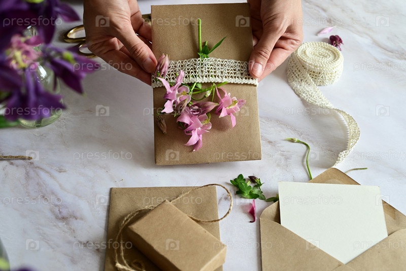 Розовые и голубые цветы, открытка, крафт, шпагат. Макет женского дня или Дня матери, Дня святого Валентина, плоский, вид сверху