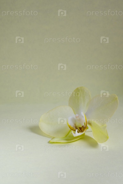 Монохромный желтый баннер открытки в минималистском стиле, один желтый цветок орхидеи крупным планом с местом для текста