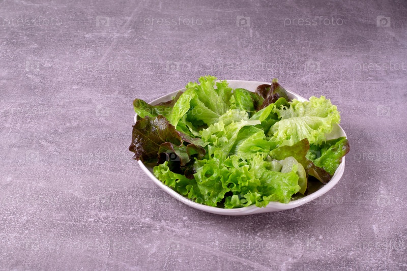 Зеленый салат с тремя видами листьев салата на белой тарелке. Здоровое питание. Копировать пространство