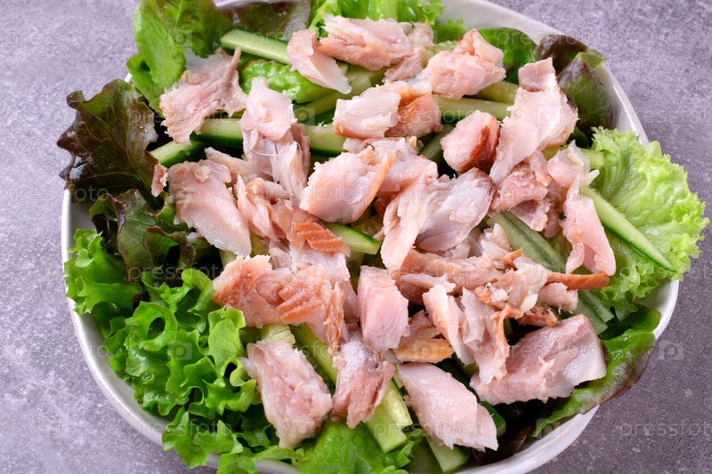 Салат с кларией сома горячего копчения, огурцом и листьями салата, заправленный лимонным соком, соевым соусом, медом и оливковым маслом