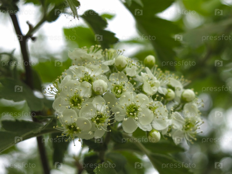 Боярышник (Rosaceae, Crataegus) цветет весной с белыми цветами
