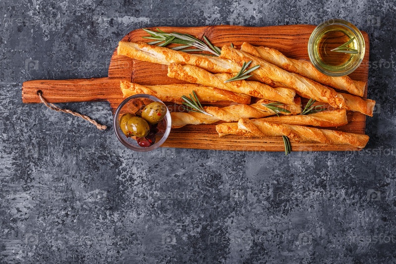 Хлебные палочки гриссини на деревянной разделочной доске над бетонной текстурированной поверхностью