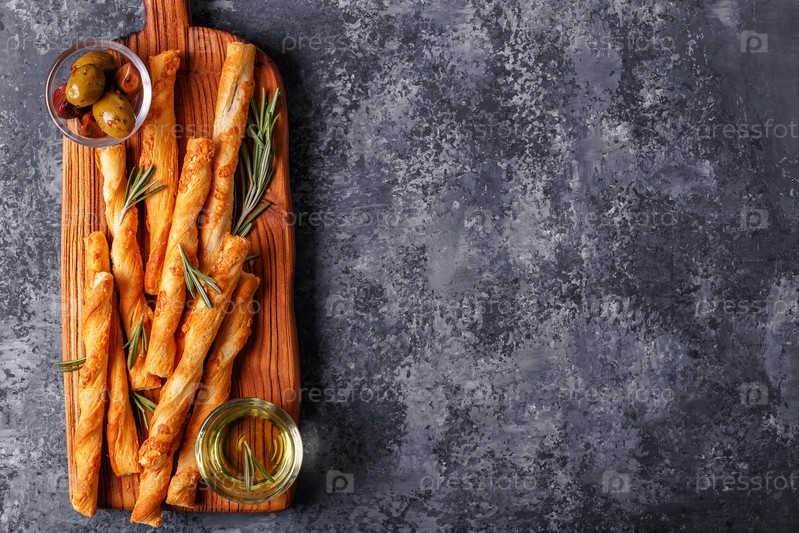 Хлебные палочки гриссини на деревянной разделочной доске над бетонной текстурированной поверхностью