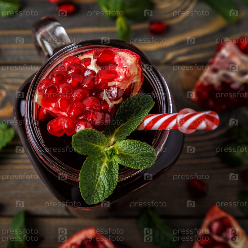 Стакан гранатового сока со свежими фруктами граната и мятой на деревянном столе