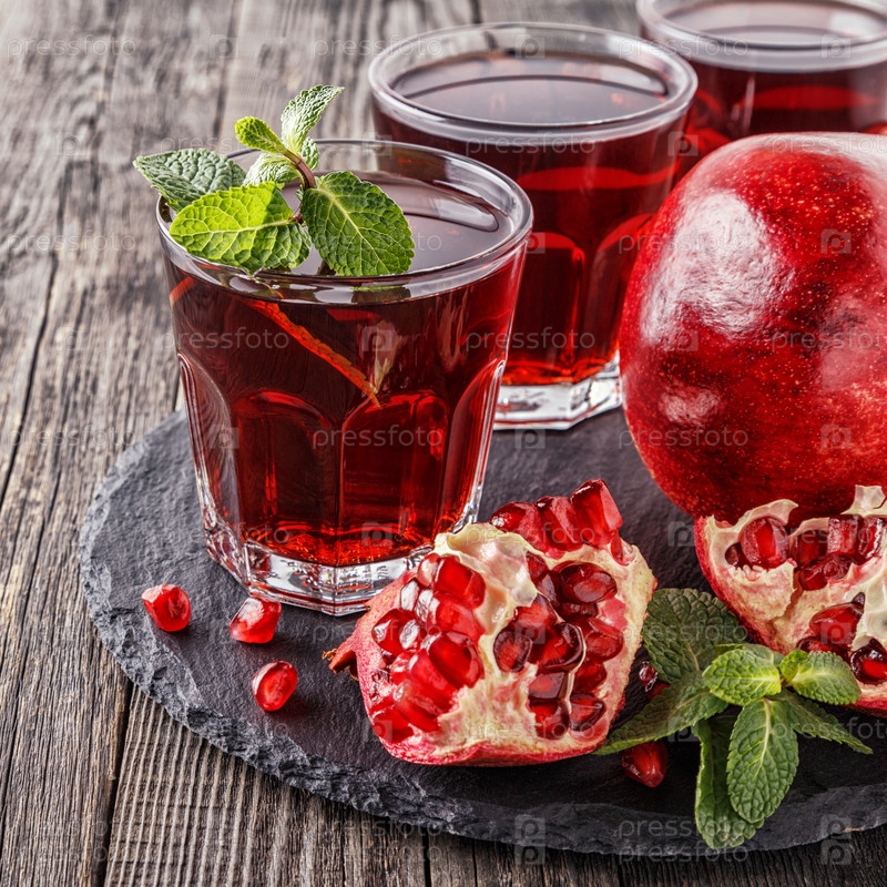 Стаканы гранатового сока со свежими фруктами граната и мятой на деревянном столе