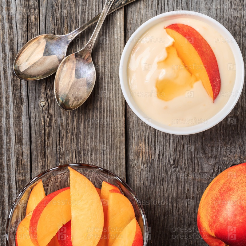 Домашний йогурт со свежими персиками на деревянном фоне