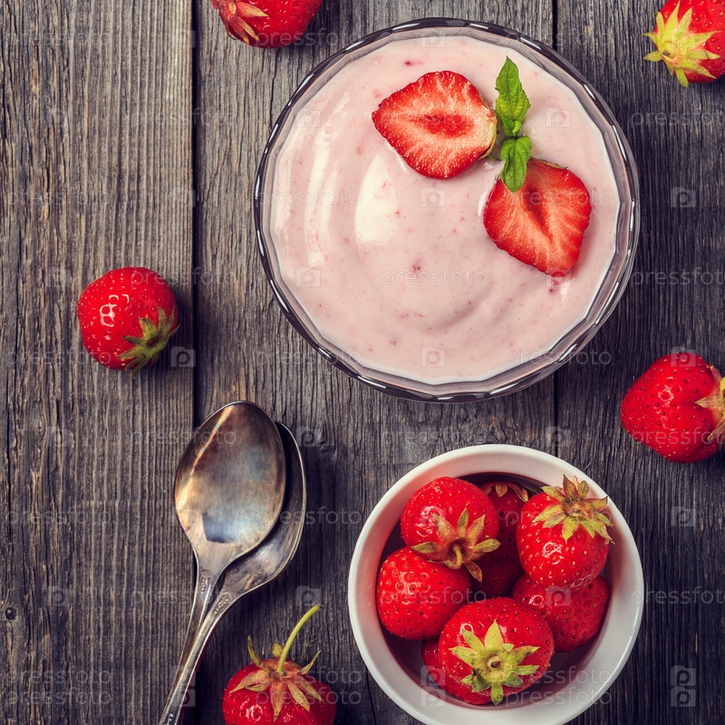 Домашний йогурт со свежей клубникой на деревянном фоне