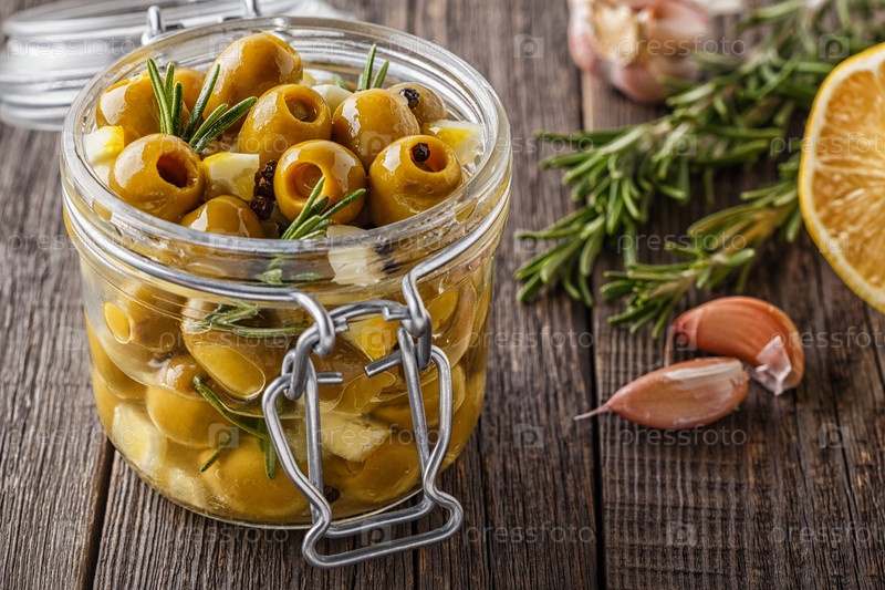 Свежие оливки с розмарином, чесноком, лимоном