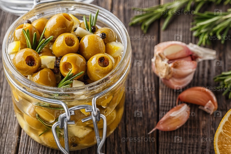 Свежие оливки с розмарином, чесноком, лимоном