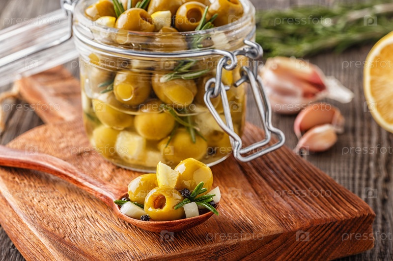 Свежие оливки с розмарином, чесноком, лимоном