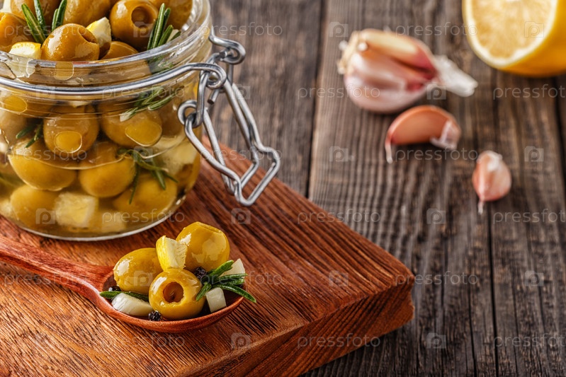 Свежие оливки с розмарином, чесноком, лимоном
