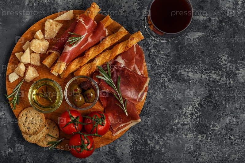 Выбор сырных и мясных закусок. Прошутто, пармезан, хлебные палочки, оливки, помидоры на деревянной доске