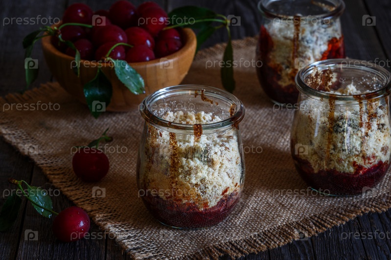 Домашний вишневый крамбл в стеклянных банках на темном деревянном фоне