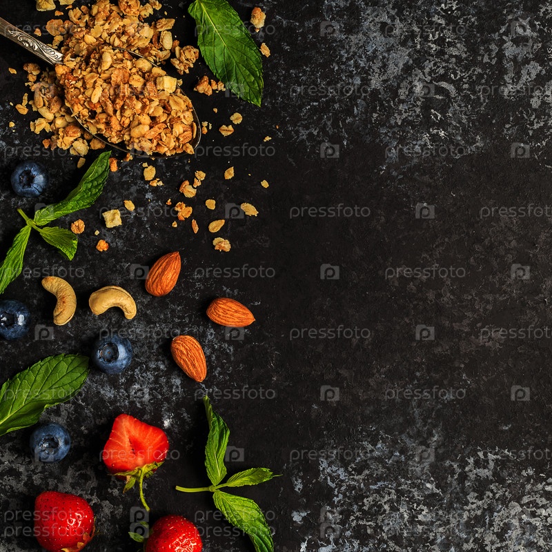 Вкусные ингредиенты (мюсли, ягоды и орехи) на завтрак, вид сверху